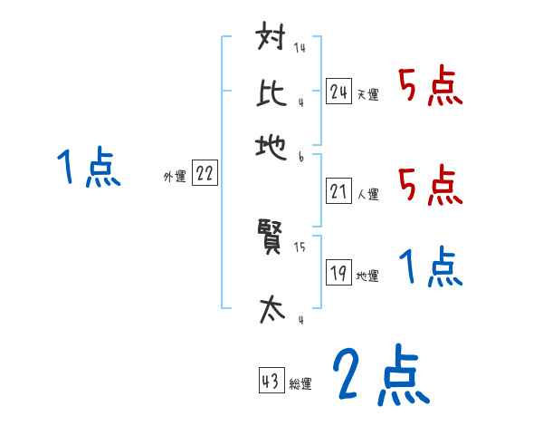 総運![]() | 対比地賢太さんの総運は43画の2つ星!頑固な性格で独立心が強いかも。やや非現実的で浪費に注意しましょう。 あなたの人生を表す1番重要な運勢です。生涯を通じて影響する総合運となり、主に50歳以降の晩年期に影響を及ぼします。 |