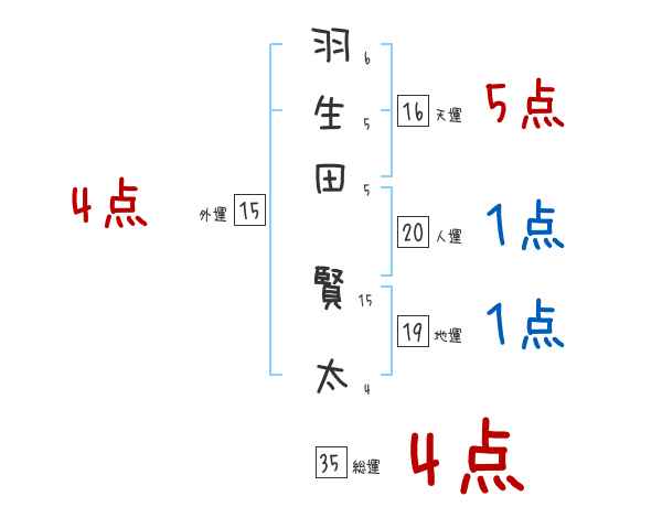 総運![]() | 羽生田賢太さんの総運は35画の4つ星!温厚な性格で感受性が高い。穏和な性格で人望が厚い。 あなたの人生を表す1番重要な運勢です。生涯を通じて影響する総合運となり、主に50歳以降の晩年期に影響を及ぼします。 |