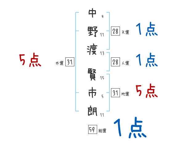天運![]() | 中野渡賢市朗さんの天運は28画の1つ星!家庭環境に注意。スポーツで活躍できる能力があるかも。 家系が持つ宿命的な運勢を表します。祖先から受け継いだ苗字ですので自分の力が及びません。家柄を象徴します。 |