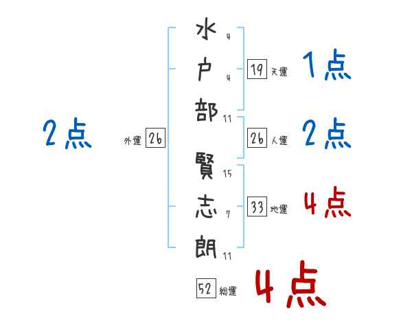 外運![]() | 水戸部賢志朗さんの外運は26画の2つ星!波瀾万丈かも。信頼できる人を大事にしましょう。 生活面を象徴する運勢です。外部から受ける影響力を表し、結婚運、家庭運や職場、環境への順応性を表します。 |