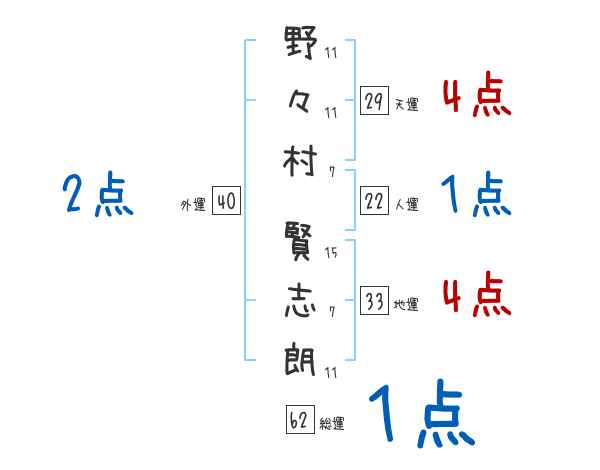 天運![]() | 野々村賢志朗さんの天運は29画の4つ星!完全主義で才能がある。厳格な心の持ち主。 家系が持つ宿命的な運勢を表します。祖先から受け継いだ苗字ですので自分の力が及びません。家柄を象徴します。 |
