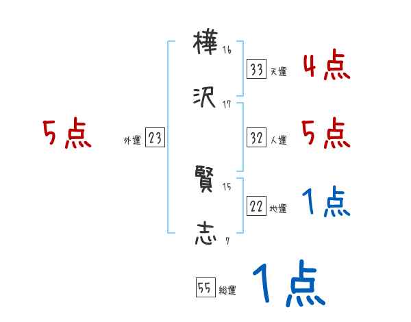 人運![]() | 樺沢賢志さんの人運は32画の5つ星!柔軟性があり成功する。チャンスが多く金運が良い。 性格や才能などを表す2番目に重要な運勢です。人間関係や協調性、社会的な成功に影響します。主に20歳から50歳ぐらいまでの中年期の運勢を表します。 |