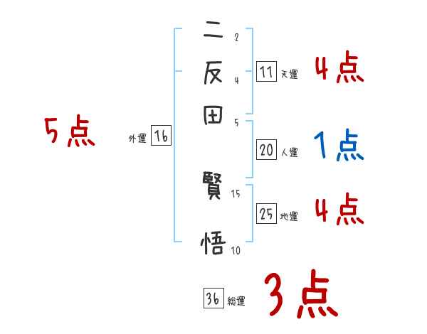 総運![]() | 二反田賢悟さんの総運は36画の3つ星!先見性が豊かです。多少神経質で苦労することも。 あなたの人生を表す1番重要な運勢です。生涯を通じて影響する総合運となり、主に50歳以降の晩年期に影響を及ぼします。 |
