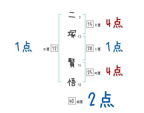 総運![]() | 二塚賢悟さんの総運は40画の2つ星!自信過剰で物事に固執するためトラブルに注意。 あなたの人生を表す1番重要な運勢です。生涯を通じて影響する総合運となり、主に50歳以降の晩年期に影響を及ぼします。 |