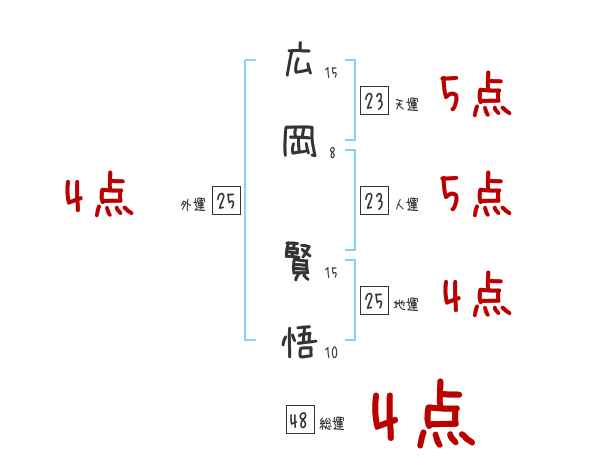 天運![]() | 広岡賢悟さんの天運は23画の5つ星!想像力に優れ活力がある。一代で成功し名誉を手に入れる。 家系が持つ宿命的な運勢を表します。祖先から受け継いだ苗字ですので自分の力が及びません。家柄を象徴します。 |