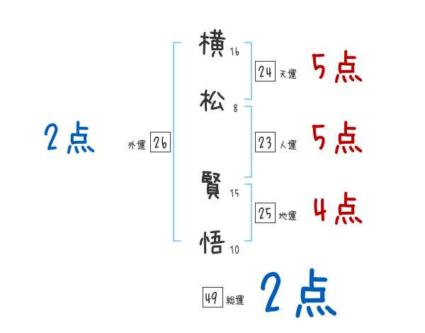 天運![]() | 横松賢悟さんの天運は24画の5つ星!家庭運が良く順調な人生。金運にも恵まれる。 家系が持つ宿命的な運勢を表します。祖先から受け継いだ苗字ですので自分の力が及びません。家柄を象徴します。 |
