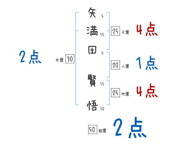 天運![]() | 矢満田賢悟さんの天運は25画の4つ星!個性があり才能があふれる。強運の持ち主で発展する。 家系が持つ宿命的な運勢を表します。祖先から受け継いだ苗字ですので自分の力が及びません。家柄を象徴します。 |