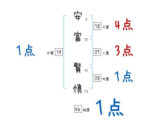 天運![]() | 安富賢慎さんの天運は18画の4つ星!情熱的で剛気。忍耐力があり信頼される。 家系が持つ宿命的な運勢を表します。祖先から受け継いだ苗字ですので自分の力が及びません。家柄を象徴します。 |