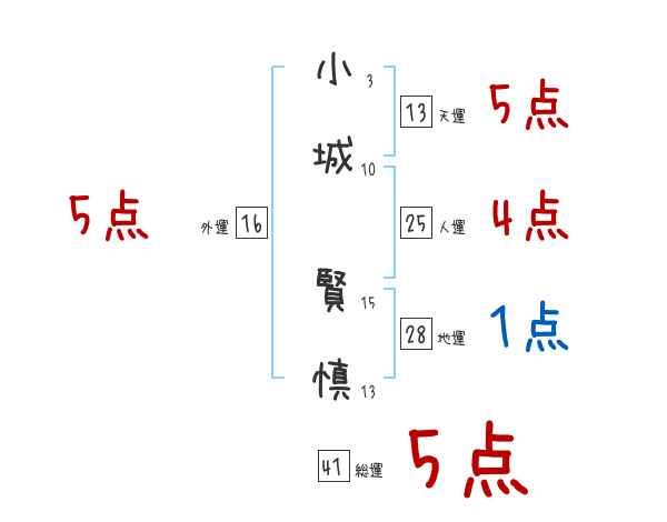 天運![]() | 小城賢慎さんの天運は13画の5つ星!才能に恵まれ人気がある。名声を手に入れる。円満な人生。 家系が持つ宿命的な運勢を表します。祖先から受け継いだ苗字ですので自分の力が及びません。家柄を象徴します。 |