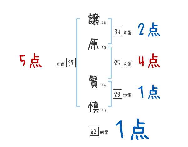天運![]() | 譲原賢慎さんの天運は34画の2つ星!独創性に優れるが、自尊心が強く災難に注意しましょう。 家系が持つ宿命的な運勢を表します。祖先から受け継いだ苗字ですので自分の力が及びません。家柄を象徴します。 |