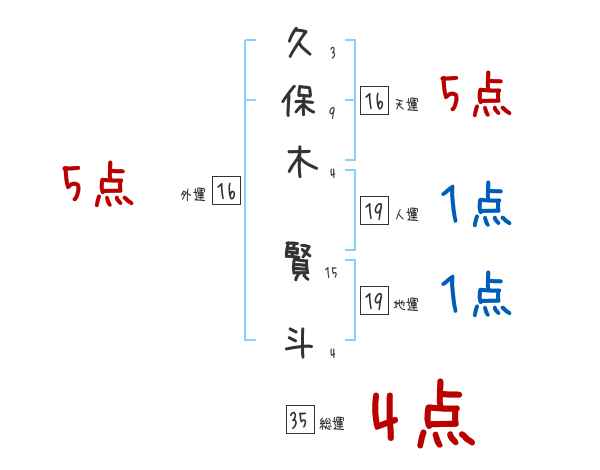 総運![]() | 久保木賢斗さんの総運は35画の4つ星!温厚な性格で感受性が高い。穏和な性格で人望が厚い。 あなたの人生を表す1番重要な運勢です。生涯を通じて影響する総合運となり、主に50歳以降の晩年期に影響を及ぼします。 |