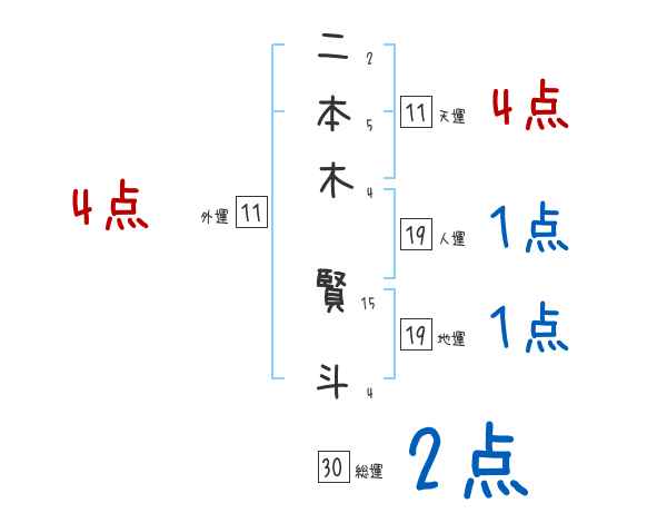 天運![]() | 二本木賢斗さんの天運は11画の4つ星!着実に富や地位を得る幸運な人生。 家系が持つ宿命的な運勢を表します。祖先から受け継いだ苗字ですので自分の力が及びません。家柄を象徴します。 |