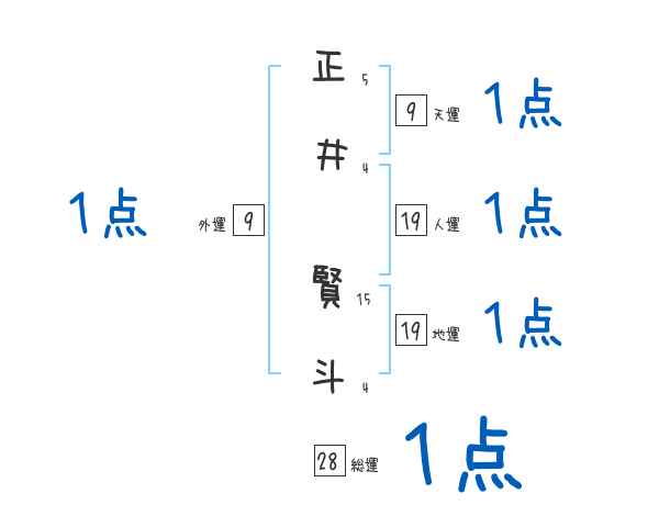 天運![]() | 正井賢斗さんの天運は9画の1つ星!消極的で才能を発揮することが苦手なことも。周りの意見に耳を傾けましょう。 家系が持つ宿命的な運勢を表します。祖先から受け継いだ苗字ですので自分の力が及びません。家柄を象徴します。 |