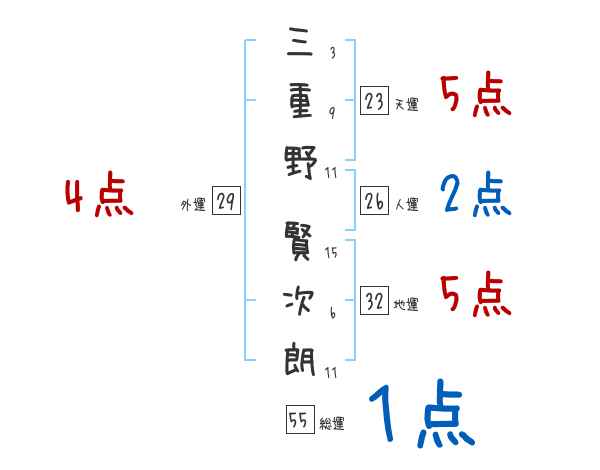 地運![]() | 三重野賢次朗さんの地運は32画の5つ星!柔軟性があり成功する。チャンスが多く金運が良い。 個性を表す基礎的な運勢です。性格形成や対人関係、行動力など家庭環境に影響されます。主に誕生してから20歳くらいまでの若年期の運勢を表します。 |