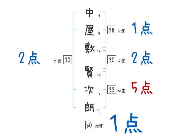 地運![]() | 中屋敷賢次朗さんの地運は32画の5つ星!柔軟性があり成功する。チャンスが多く金運が良い。 個性を表す基礎的な運勢です。性格形成や対人関係、行動力など家庭環境に影響されます。主に誕生してから20歳くらいまでの若年期の運勢を表します。 |