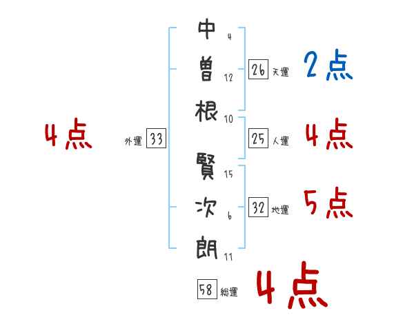 外運![]() | 中曽根賢次朗さんの外運は33画の4つ星!権力志向でプライドが高い。勇気があり運を切り開き成功する。 生活面を象徴する運勢です。外部から受ける影響力を表し、結婚運、家庭運や職場、環境への順応性を表します。 |