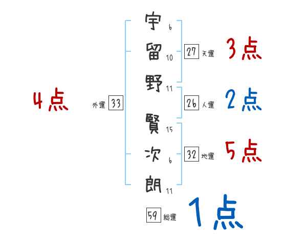 天運![]() | 宇留野賢次朗さんの天運は27画の3つ星!頭脳明晰だが強情で摩擦が多い傾向。孤立に注意。 家系が持つ宿命的な運勢を表します。祖先から受け継いだ苗字ですので自分の力が及びません。家柄を象徴します。 |