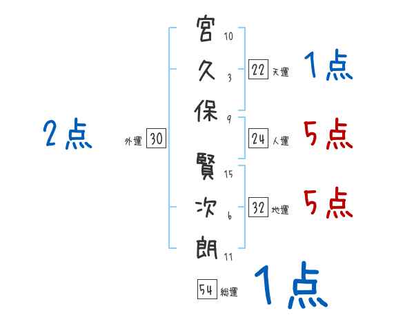 外運![]() | 宮久保賢次朗さんの外運は30画の2つ星!浮き沈みの激しさに注意しましょう。 生活面を象徴する運勢です。外部から受ける影響力を表し、結婚運、家庭運や職場、環境への順応性を表します。 |