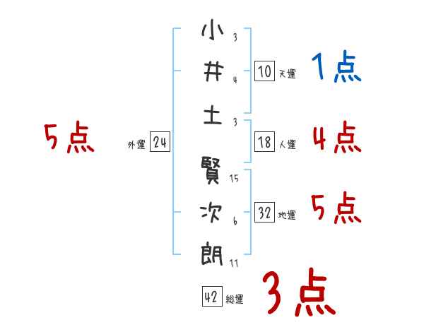 外運![]() | 小井土賢次朗さんの外運は24画の5つ星!家庭運が良く順調な人生。金運にも恵まれる。 生活面を象徴する運勢です。外部から受ける影響力を表し、結婚運、家庭運や職場、環境への順応性を表します。 |