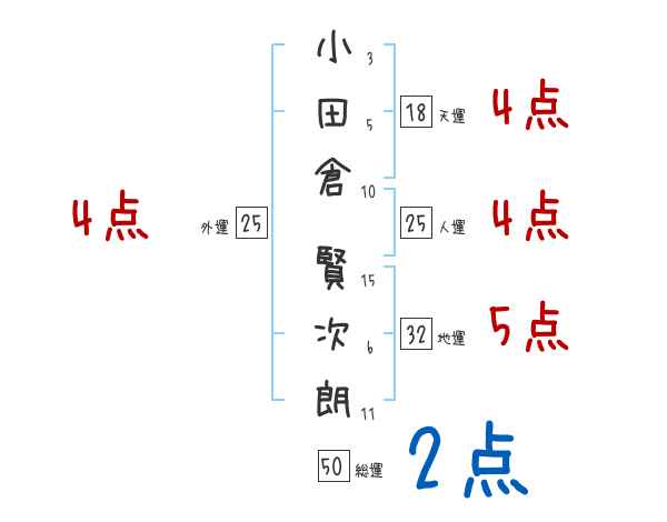 外運![]() | 小田倉賢次朗さんの外運は25画の4つ星!個性があり才能があふれる。強運の持ち主で発展する。 生活面を象徴する運勢です。外部から受ける影響力を表し、結婚運、家庭運や職場、環境への順応性を表します。 |