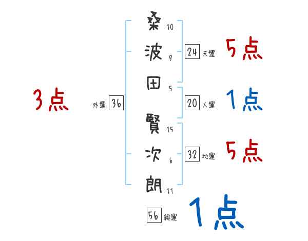 外運![]() | 桑波田賢次朗さんの外運は36画の3つ星!先見性が豊かです。多少神経質で苦労することも。 生活面を象徴する運勢です。外部から受ける影響力を表し、結婚運、家庭運や職場、環境への順応性を表します。 |