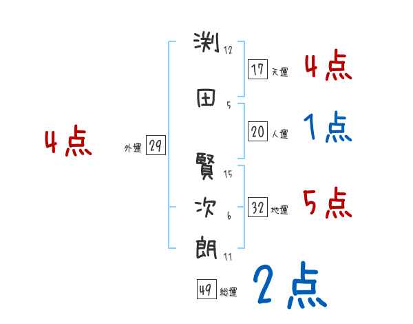 外運![]() | 渕田賢次朗さんの外運は29画の4つ星!完全主義で才能がある。厳格な心の持ち主。 生活面を象徴する運勢です。外部から受ける影響力を表し、結婚運、家庭運や職場、環境への順応性を表します。 |