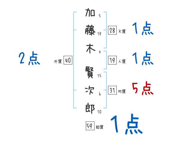 天運![]() | 加藤木賢次郎さんの天運は28画の1つ星!家庭環境に注意。スポーツで活躍できる能力があるかも。 家系が持つ宿命的な運勢を表します。祖先から受け継いだ苗字ですので自分の力が及びません。家柄を象徴します。 |