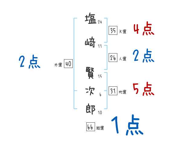 人運![]() | 塩﨑賢次郎さんの人運は26画の2つ星!波瀾万丈かも。信頼できる人を大事にしましょう。 性格や才能などを表す2番目に重要な運勢です。人間関係や協調性、社会的な成功に影響します。主に20歳から50歳ぐらいまでの中年期の運勢を表します。 |