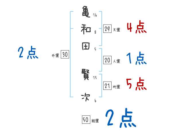 総運![]() | 亀和田賢次さんの総運は50画の2つ星!浮き沈みが激しく不安定。しりすぼみに衰退しやすいので注意しましょう。 あなたの人生を表す1番重要な運勢です。生涯を通じて影響する総合運となり、主に50歳以降の晩年期に影響を及ぼします。 |