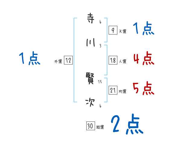 天運![]() | 寺川賢次さんの天運は9画の1つ星!消極的で才能を発揮することが苦手なことも。周りの意見に耳を傾けましょう。 家系が持つ宿命的な運勢を表します。祖先から受け継いだ苗字ですので自分の力が及びません。家柄を象徴します。 |