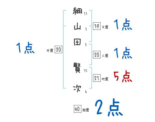 天運![]() | 細山田賢次さんの天運は19画の1つ星!優れた才能を持ちますが、協調性が足りないことも。周りの人と協力する事を意識しましょう。 家系が持つ宿命的な運勢を表します。祖先から受け継いだ苗字ですので自分の力が及びません。家柄を象徴します。 |