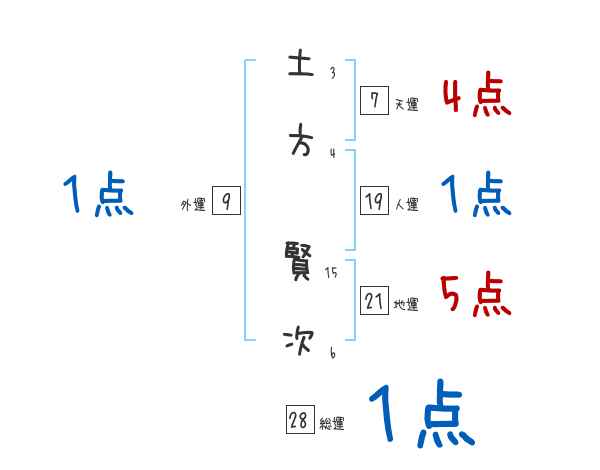 総運![]() | 土方賢次さんの総運は28画の1つ星!家庭環境に注意。スポーツで活躍できる能力があるかも。 あなたの人生を表す1番重要な運勢です。生涯を通じて影響する総合運となり、主に50歳以降の晩年期に影響を及ぼします。 |