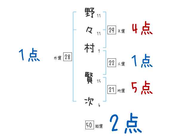 総運![]() | 野々村賢次さんの総運は50画の2つ星!浮き沈みが激しく不安定。しりすぼみに衰退しやすいので注意しましょう。 あなたの人生を表す1番重要な運勢です。生涯を通じて影響する総合運となり、主に50歳以降の晩年期に影響を及ぼします。 |