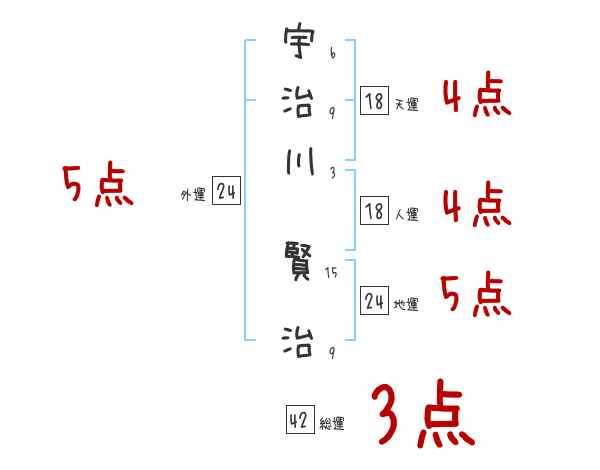 天運![]() | 宇治川賢治さんの天運は18画の4つ星!情熱的で剛気。忍耐力があり信頼される。 家系が持つ宿命的な運勢を表します。祖先から受け継いだ苗字ですので自分の力が及びません。家柄を象徴します。 |