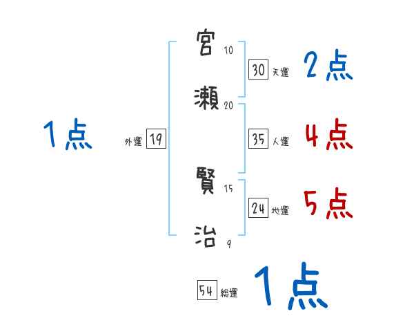 天運![]() | 宮瀬賢治さんの天運は30画の2つ星!浮き沈みの激しさに注意しましょう。 家系が持つ宿命的な運勢を表します。祖先から受け継いだ苗字ですので自分の力が及びません。家柄を象徴します。 |