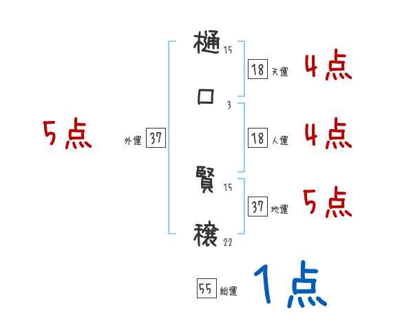 天運![]() | 樋口賢穣さんの天運は18画の4つ星!情熱的で剛気。忍耐力があり信頼される。 家系が持つ宿命的な運勢を表します。祖先から受け継いだ苗字ですので自分の力が及びません。家柄を象徴します。 |