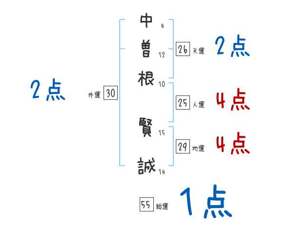 天運![]() | 中曽根賢誠さんの天運は26画の2つ星!波瀾万丈かも。信頼できる人を大事にしましょう。 家系が持つ宿命的な運勢を表します。祖先から受け継いだ苗字ですので自分の力が及びません。家柄を象徴します。 |