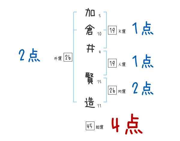人運![]() | 加倉井賢造さんの人運は19画の1つ星!優れた才能を持ちますが、協調性が足りないことも。周りの人と協力する事を意識しましょう。 性格や才能などを表す2番目に重要な運勢です。人間関係や協調性、社会的な成功に影響します。主に20歳から50歳ぐらいまでの中年期の運勢を表します。 |