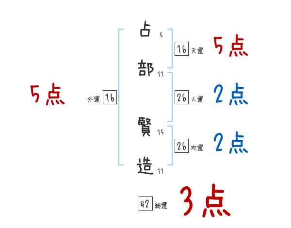 外運![]() | 占部賢造さんの外運は16画の5つ星!人望が厚く大きく発展する。逆転成功が見える。 生活面を象徴する運勢です。外部から受ける影響力を表し、結婚運、家庭運や職場、環境への順応性を表します。 |