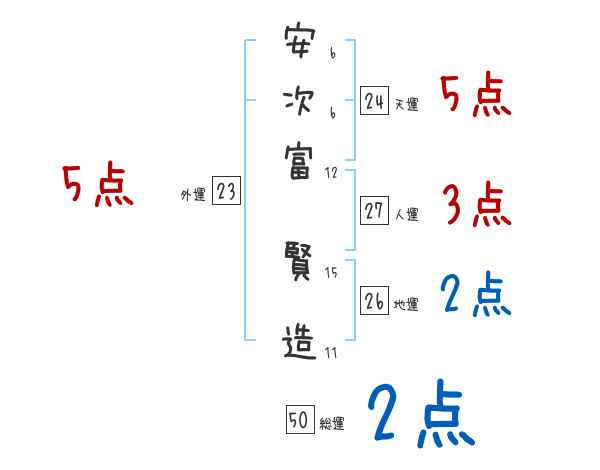 天運![]() | 安次富賢造さんの天運は24画の5つ星!家庭運が良く順調な人生。金運にも恵まれる。 家系が持つ宿命的な運勢を表します。祖先から受け継いだ苗字ですので自分の力が及びません。家柄を象徴します。 |
