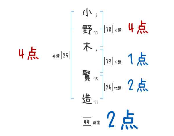 総運![]() | 小野木賢造さんの総運は44画の2つ星!誠実で慎重な性格。物事を考えすぎないように注意しましょう。 あなたの人生を表す1番重要な運勢です。生涯を通じて影響する総合運となり、主に50歳以降の晩年期に影響を及ぼします。 |