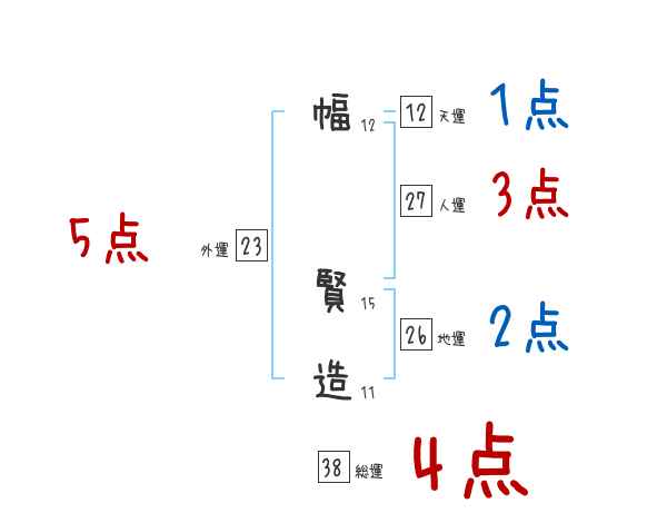 外運![]() | 幅賢造さんの外運は23画の5つ星!想像力に優れ活力がある。一代で成功し名誉を手に入れる。 生活面を象徴する運勢です。外部から受ける影響力を表し、結婚運、家庭運や職場、環境への順応性を表します。 |