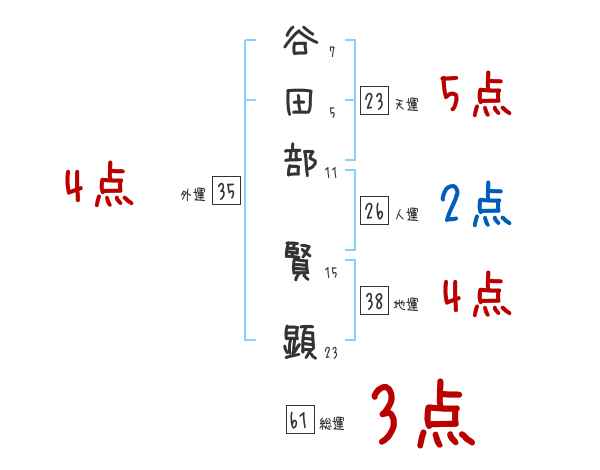 外運![]() | 谷田部賢顕さんの外運は35画の4つ星!温厚な性格で感受性が高い。穏和な性格で人望が厚い。 生活面を象徴する運勢です。外部から受ける影響力を表し、結婚運、家庭運や職場、環境への順応性を表します。 |