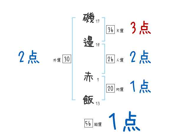 外運![]() | 磯邊赤飯さんの外運は30画の2つ星!浮き沈みの激しさに注意しましょう。 生活面を象徴する運勢です。外部から受ける影響力を表し、結婚運、家庭運や職場、環境への順応性を表します。 |