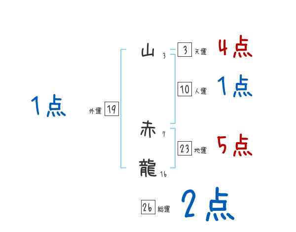 天運![]() | 山赤龍さんの天運は3画の4つ星!活動的で才能に恵まれ、多くの信頼を得る。希望に満ち成長する。 家系が持つ宿命的な運勢を表します。祖先から受け継いだ苗字ですので自分の力が及びません。家柄を象徴します。 |
