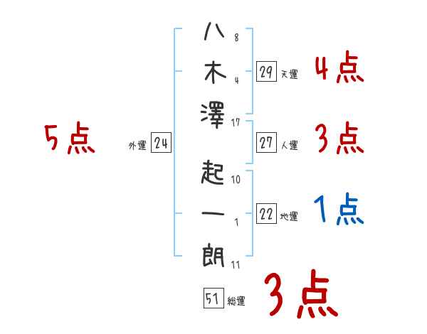 外運![]() | 八木澤起一朗さんの外運は24画の5つ星!家庭運が良く順調な人生。金運にも恵まれる。 生活面を象徴する運勢です。外部から受ける影響力を表し、結婚運、家庭運や職場、環境への順応性を表します。 |