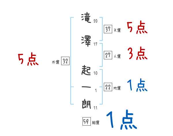 外運![]() | 滝澤起一朗さんの外運は32画の5つ星!柔軟性があり成功する。チャンスが多く金運が良い。 生活面を象徴する運勢です。外部から受ける影響力を表し、結婚運、家庭運や職場、環境への順応性を表します。 |