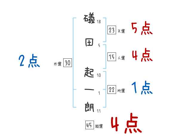 総運![]() | 礒田起一朗さんの総運は45画の4つ星!もくもくと物事を進め達成する。地味な努力家。 あなたの人生を表す1番重要な運勢です。生涯を通じて影響する総合運となり、主に50歳以降の晩年期に影響を及ぼします。 |
