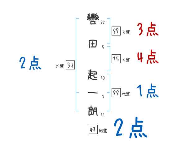 外運![]() | 轡田起一朗さんの外運は34画の2つ星!独創性に優れるが、自尊心が強く災難に注意しましょう。 生活面を象徴する運勢です。外部から受ける影響力を表し、結婚運、家庭運や職場、環境への順応性を表します。 |