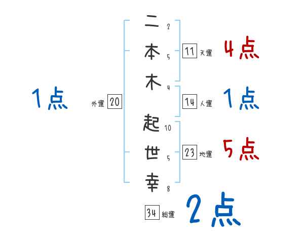 天運![]() | 二本木起世幸さんの天運は11画の4つ星!着実に富や地位を得る幸運な人生。 家系が持つ宿命的な運勢を表します。祖先から受け継いだ苗字ですので自分の力が及びません。家柄を象徴します。 |